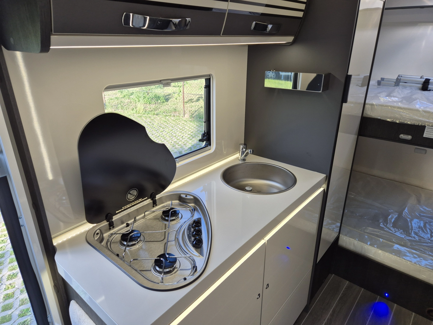 – Łóżko małżeńskie tył kampera ( 216 cm x 130 cm ) – wysokość regulowana elektrycznie