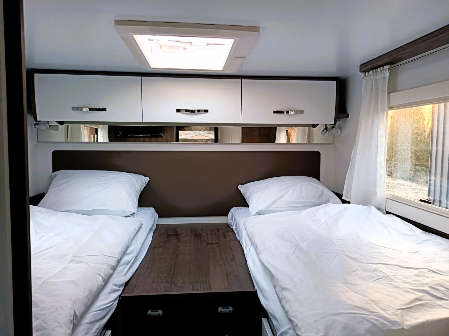Pojedyncze łóżka z tyłu (85 x 188 + 85 x 190 cm), które można przekształcić w duże łóżko podwójne (170 cm x 210 cm). Kamper posiada drzwi oddzielające część sypialnianą od dziennej dla większej prywatności.
